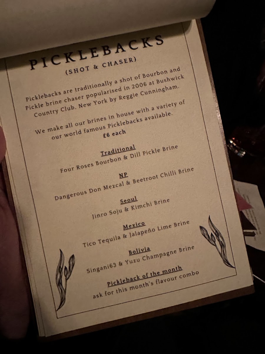 Alongside their cocktails, the menu includes a range of thoughtfully paired bites, including charcuterie and unique offerings like picklebacks, as well as a concise list of beers and ciders such as Devon Red Cider and Umbrella Ginger Beer. These options add a casual, approachable element to the experience, perfect for sharing or savoring between sips.