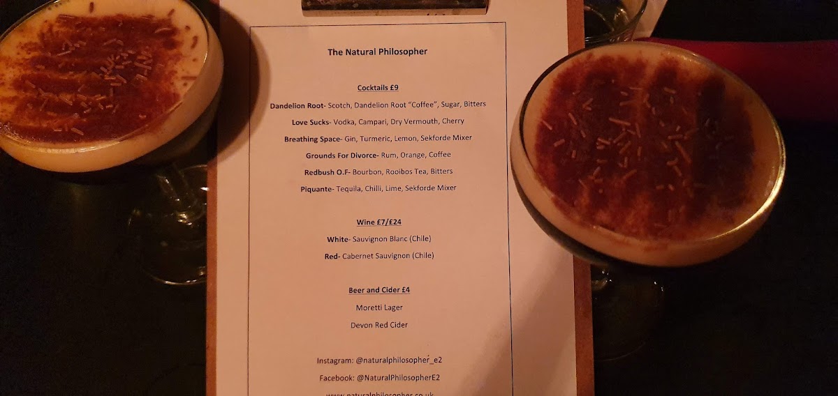 The menu at The Natural Philosopher offers a carefully curated selection of cocktails and thoughtful accompaniments that reflect the bar’s relaxed yet distinctive vibe. It’s a place where classic cocktail staples like the Pisco Sour and Espresso Martini sit comfortably alongside inventive creations featuring ingredients such as dandelion root, chilli, and raspberry. The drinks are crafted to be enjoyed throughout the evening, whether you’re settling in for after-work drinks or meeting friends late into the night.